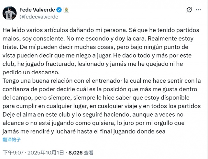 10月01日讯 巴尔韦德发布社媒,回应此前媒体报道称自己拒绝出战的说法,他表示自己与教练关系很好,愿为皇马付出一切。